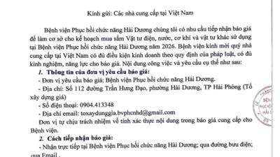 THƯ MỜI BÁO GIÁ CHO KẾ HOẠCH MUA SẮM VẬT TƯ ĐIỆN, NƯỚC, CƠ KHÍ VÀ VẬT TƯ KHÁC SỬ DỤNG TẠI BỆNH VIỆN PHỤC HỒI CHỨC NĂNG HẢI DƯƠNG NĂM 2026 BỆNH VIỆN PHỤC HỒI CHỨC NĂNG HD 09/01/2026 Đọc thêm