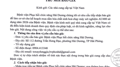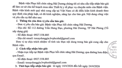 Thư mời báo giá cho kế hoạch mua sắm vật tư tiêu hao phục vụ chuyên môn của Bệnh viện Phục hồi chức năng Hải Dương năm 2026 (đợt 2) BỆNH VIỆN PHỤC HỒI CHỨC NĂNG HD 02/03/2026 Đọc thêm