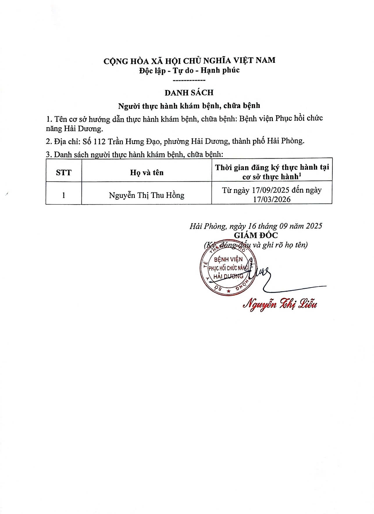 Bệnh viện Phục hồi chức năng công bố Danh sách người thực hành khám bệnh, chữa bệnh