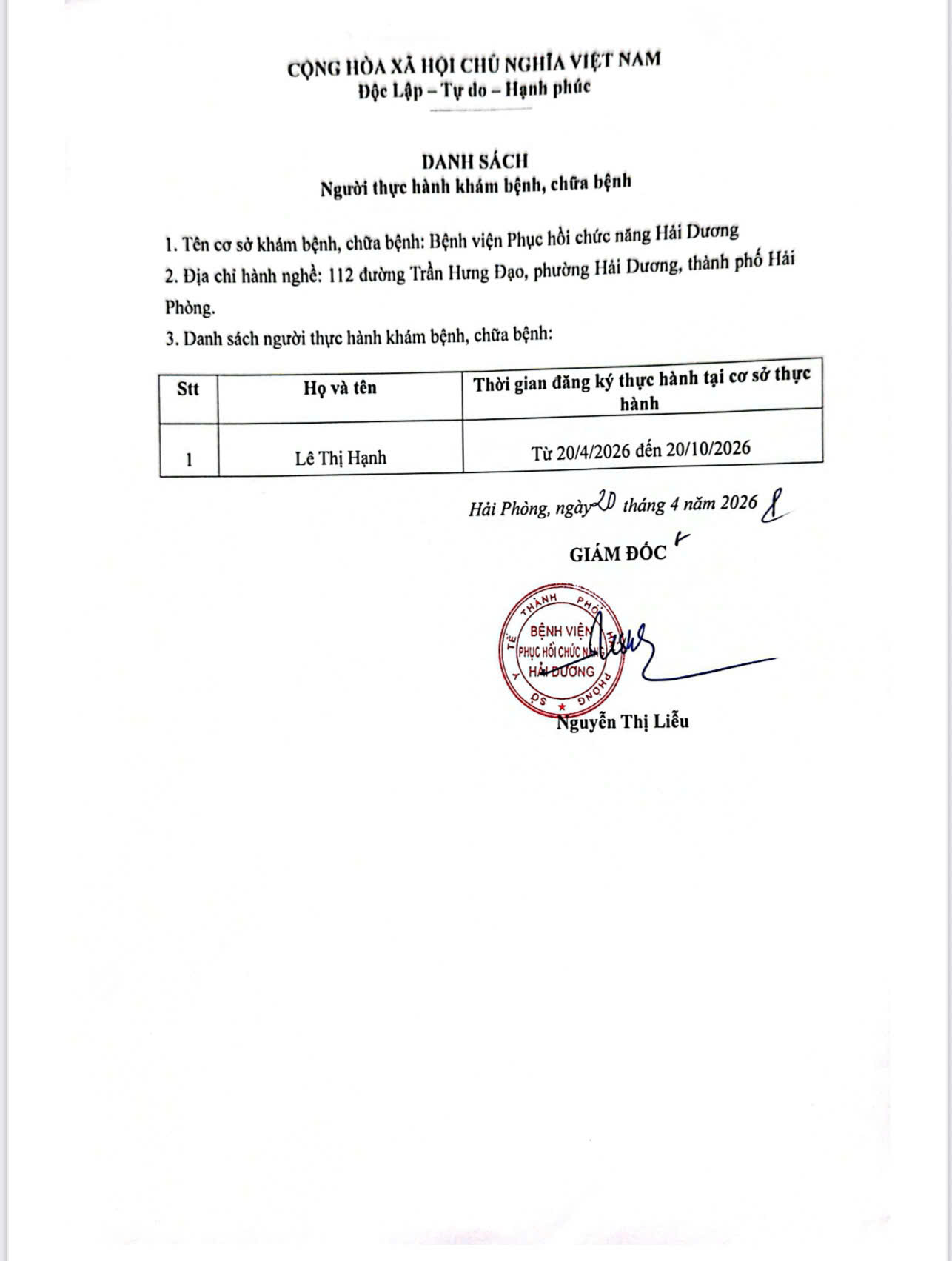 Bệnh viện Phục hồi chức năng Hải Dương xin thông báo về DS người thực hành khám bệnh, chữa bệnh:
