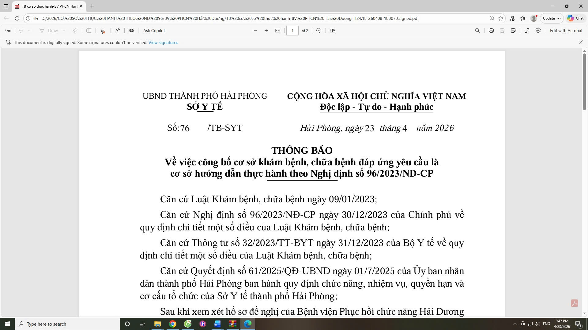 Thông báo số 76/TB-SYT ngày 23/4/2026 của Sở Y tế thành phố Hải Phòng về việc công bố Bệnh viện Phục hồi chức năng Hải Dương là cơ sở khám bệnh, chữa bệnh đáp ứng yêu cầu là cơ sở hướng dẫn thực hành theo Nghị định số 96/2023/NĐ-CP