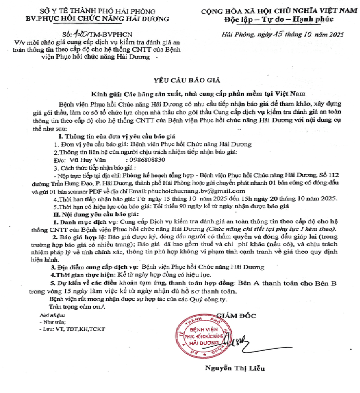 Bệnh viện Phục hồi Chức năng Hải Dương có nhu cầu tiếp nhận báo giá để tham khảo, xây dựng giá gói thầu, làm cơ sở tổ chức lựa chọn nhà thầu cho gói thầu Cung cấp dịch vụ kiểm tra đánh giá an toàn thông tin theo cấp độ cho hệ thống CNTT của Bệnh viện Phục hồi chức năng Hải Dương với nội dung cụ thể như sau: