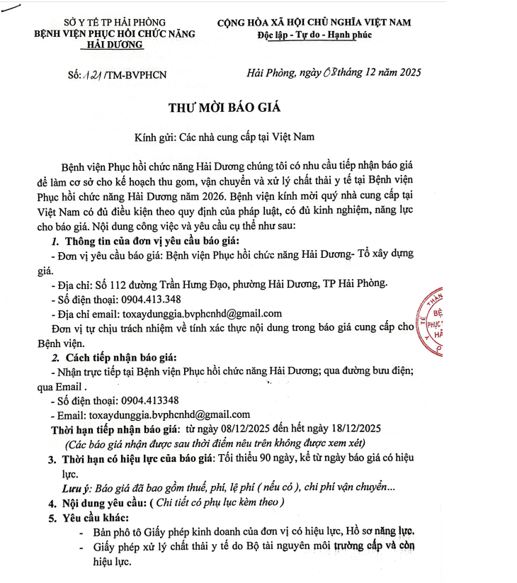 - Đơn vị yêu cầu báo giá: Bệnh viện Phục hồi chức năng Hải Dương.