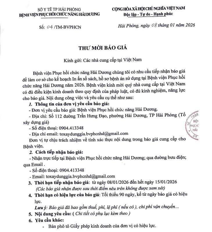Bệnh viện Phục hồi chức năng Hải Dương chúng tôi có nhu cầu tiếp nhận báo giá để làm cơ sở cho kế hoạch In ấn sổ sách, hồ sơ bệnh án sử dụng tại Bệnh viện Phục hồi chức năng Hải Dương năm 2026. Bệnh viện kính mời quý nhà cung cấp tại Việt Nam có đủ điều kiện kinh doanh theo quy định của pháp luật, có đủ kinh nghiệm, năng lực cho báo giá. Nội dung công việc và yêu cầu cụ thể như sau: