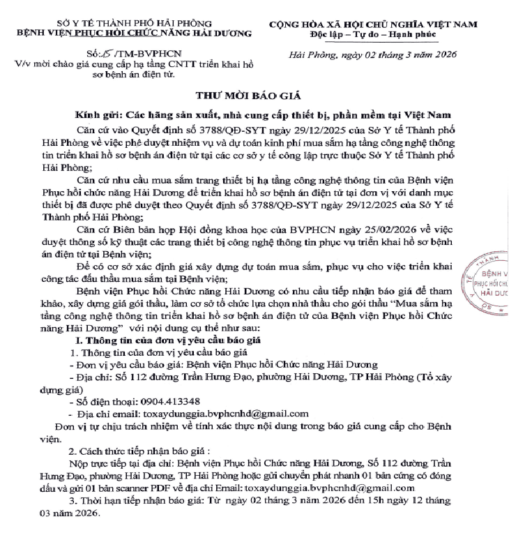Căn cứ nhu cầu mua sắm trang thiết bị hạ tầng công nghệ thông tin của Bệnh viện Phục hồi chức năng Hải Dương để triển khai hồ sơ bệnh án điện tử tại đơn vị với danh mục thiết bị đã được phê duyệt theo Quyết định số 3788/QĐ-SYT ngày 29/12/2025 của Sở Y tế Thành phố Hải Phòng;